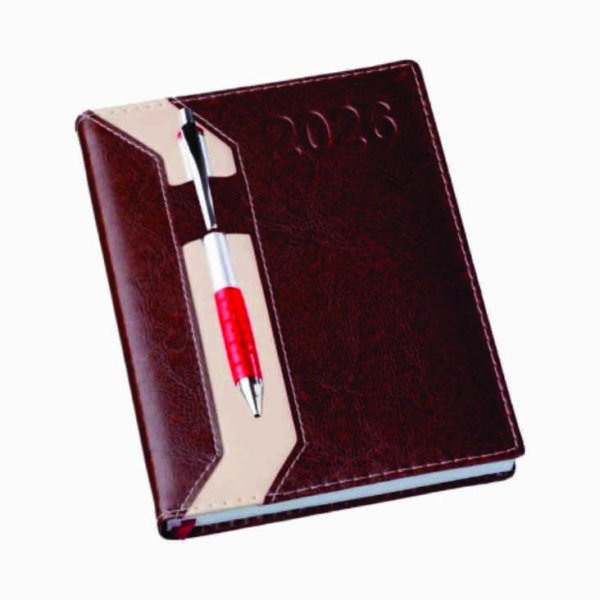 Agenda Clássica c/ Suporte de Caneta MARROM – Capa: Couro Sintético 0,6mm – Miolo de Agenda Diária – 2×2 Cores – 344 páginas – Off-set 63g com Mapa 4×4 Cores – Índice Telefônico – Planejamento. NÃO ACOMPANHA A CANETA!