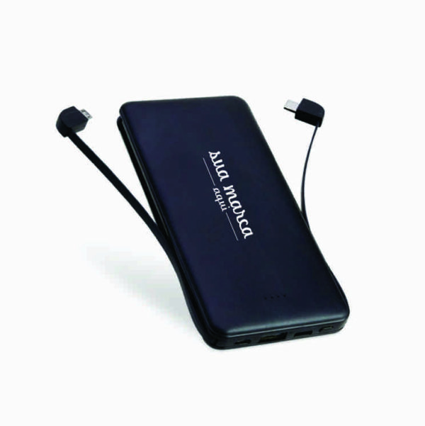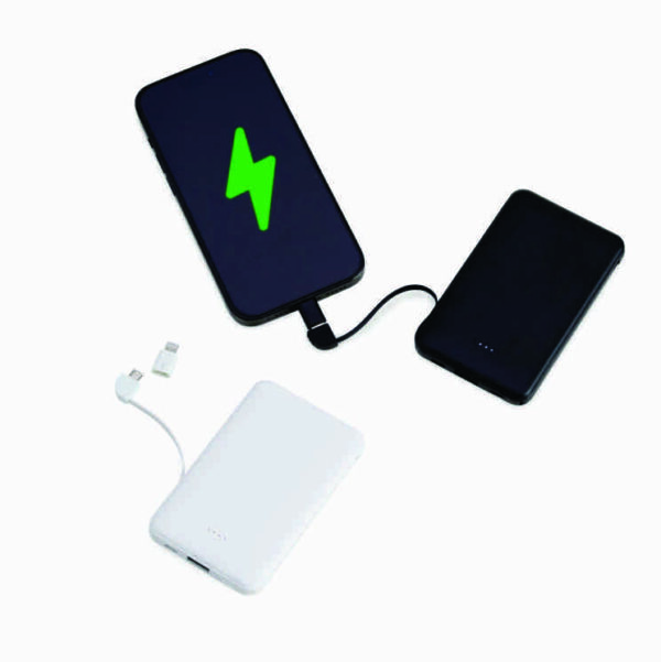 Power bank plástico de 5.000mAh com indicadores led de bateria e cabos acoplados: Tipo-C e V8. Acompanha cabo USB V8 e adaptador Lightning.